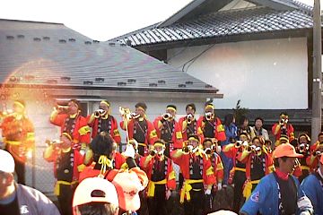 木遣りのかん高い声にあわせて、ラッパ隊の音が高らかに響く。その音に勢いづいて、曳き手も力を合わせます。