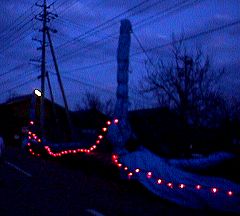 一般の道路(御柱祭街道)のはじに寄せただけなので、車が横を通るとき危険がないように夜は光を点滅させます。ちょっと、派手な御柱祭(笑)。