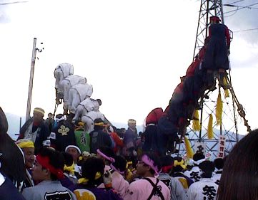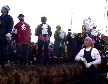 柱の直径は約1M、長さ16M、重さ1t。御柱(みはしら)に氏子が大勢のります。