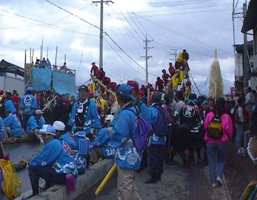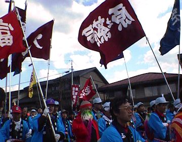 先頭はその柱を曳く地区の幡衆(はたしゅう)です。