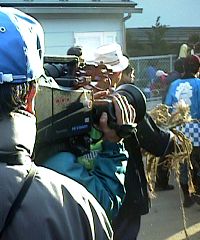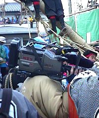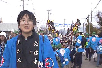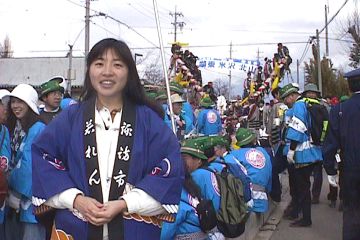 御柱祭をバックに「御柱祭初体験」の怪鳥。