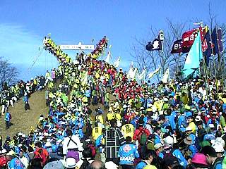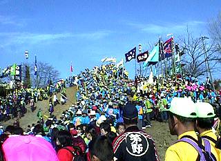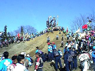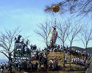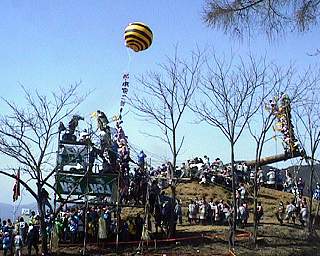 画像は木落とし坂の上まで登った「本宮二」の御柱。