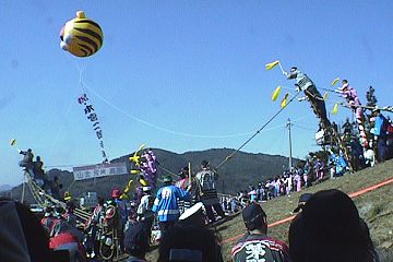 曳き綱と一緒に曳き手の人たちが降りてきます。