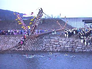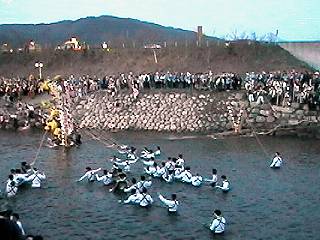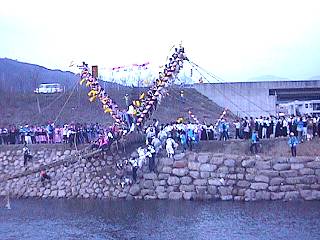 御柱を引き上げるところ(我々は、反対岸に移動してます)。