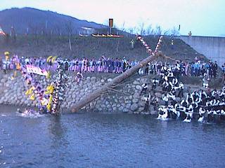 御柱の先頭が川面に入ったところ。このとき、先頭に乗ってる氏子は、川の中に頭まで浸かってしまい、結構危険です。