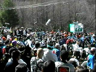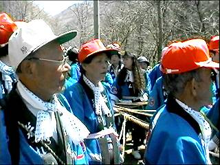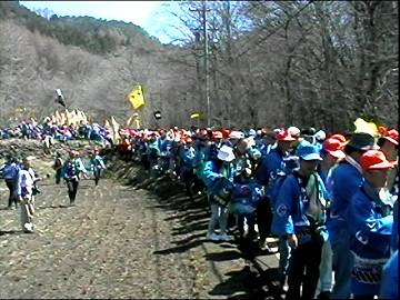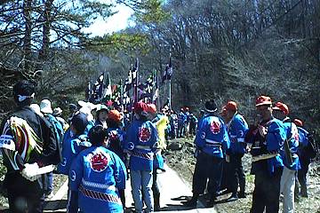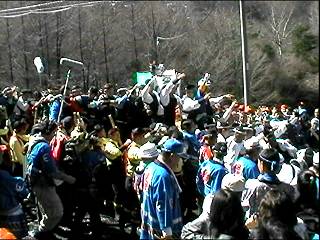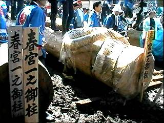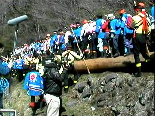 柱の上に氏子が鈴なりのまま、移動します。ちなみに先頭の青いはっぴは、現諏訪市長の笠原さんです。