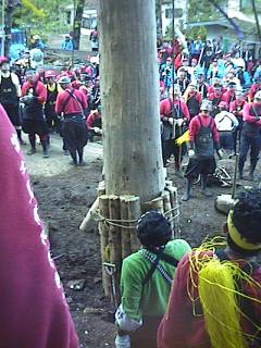 手前で群がってる人の足下あたりに柱が横たわってます。この先端部を斧で三角に尖らせることを「冠落とし」と言います(画面中央やや左に斧が見えるのがわかるでしょうか)。