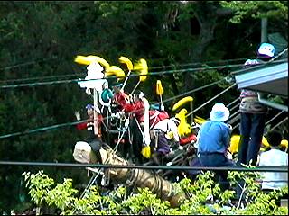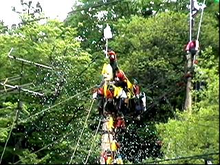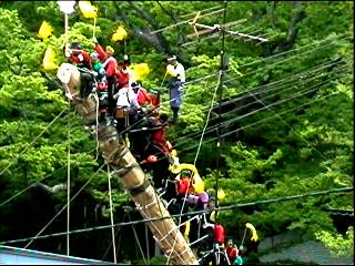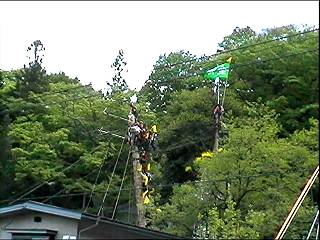 右側のやぐらに滑車がついていて、下向きにロープが曳かれていきます。