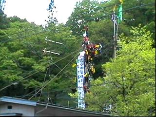 お向かいの屋根の上に、「前宮一」の御柱の先端が見えてきたところ。