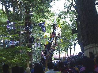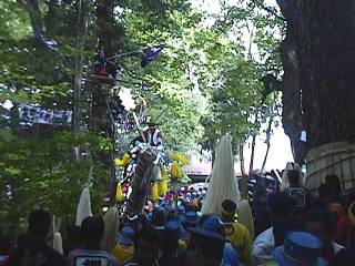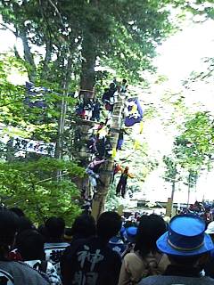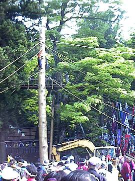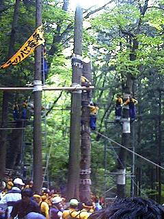 左右のバランスを修正しながら持ち上がる御柱。乗ってる人のバランスも崩れ気味。