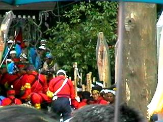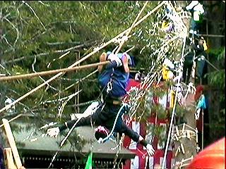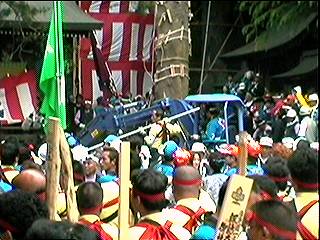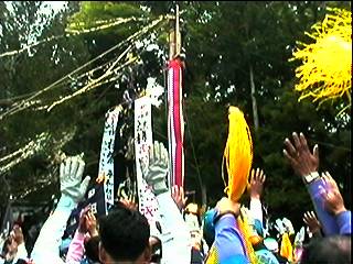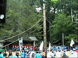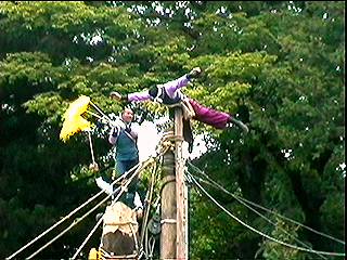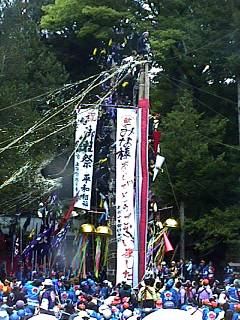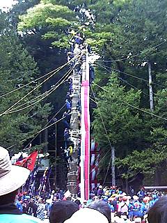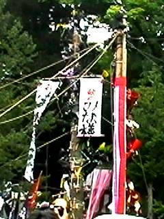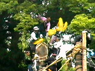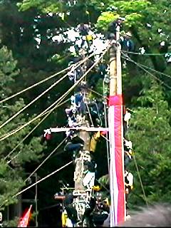 補助の柱を支える綱と交差し、てっぺん乗りの人は、くぐったりまたいだりしながら進行しました。