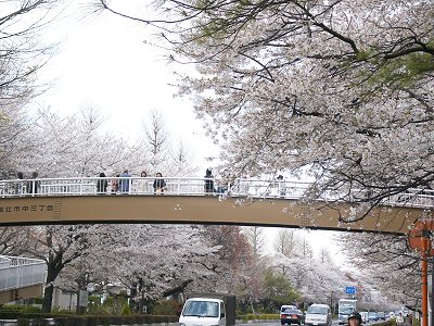 この歩道橋からは桜がよく見えるので見物人も大勢います。