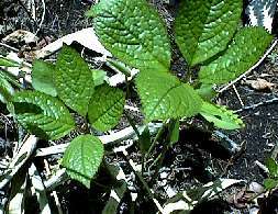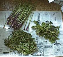 わらびの様子。 収穫した一部の山フキ(上)ワラビ(下)タラの芽(右)。